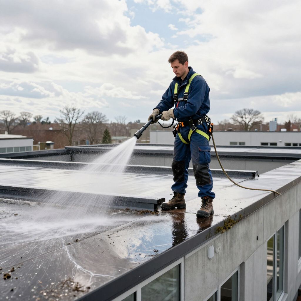 Verwijderen van mos en vuil van een plat dak om de levensduur van het dak te verlengen en lekkages te voorkomen.