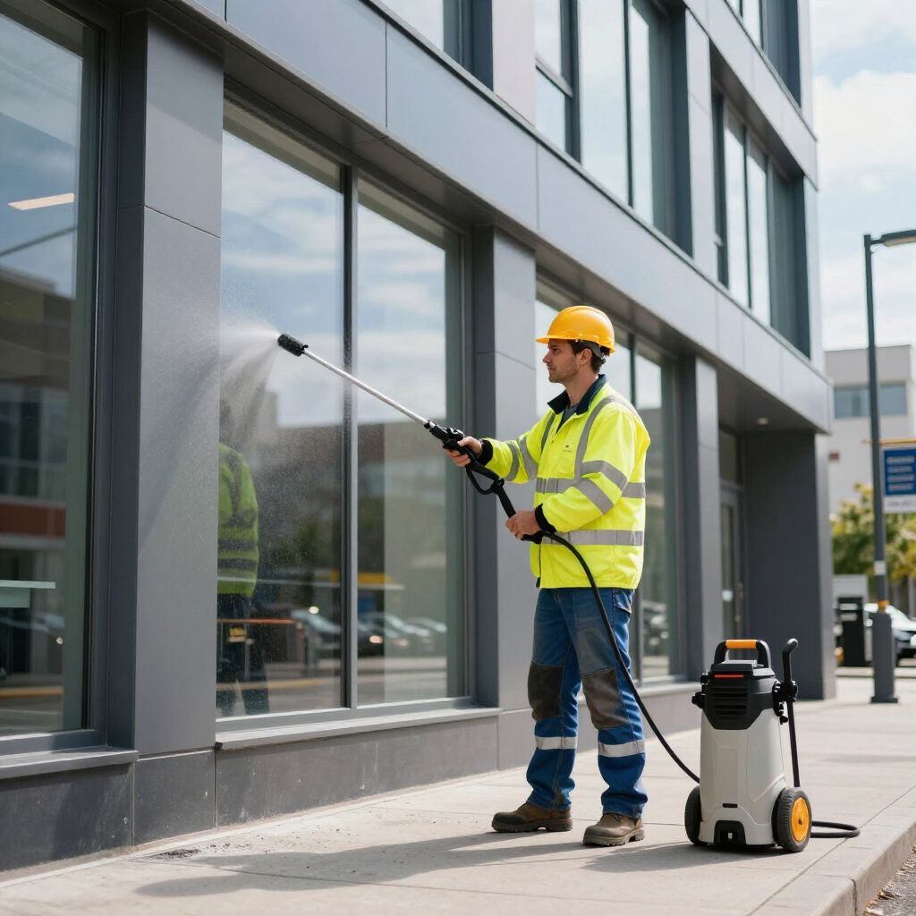 Reiniging van een bedrijfsgevel waarbij hardnekkig vuil en aanslag effectief zijn verwijderd voor een frisse uitstraling.